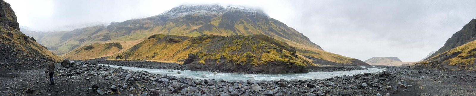 Our next stop took us on a rainy cold walk in this valley along this river. Another huge field of black rock without a trail or markings. But maybe there was a pool here. A hot spring pool. Seljavallalaug.