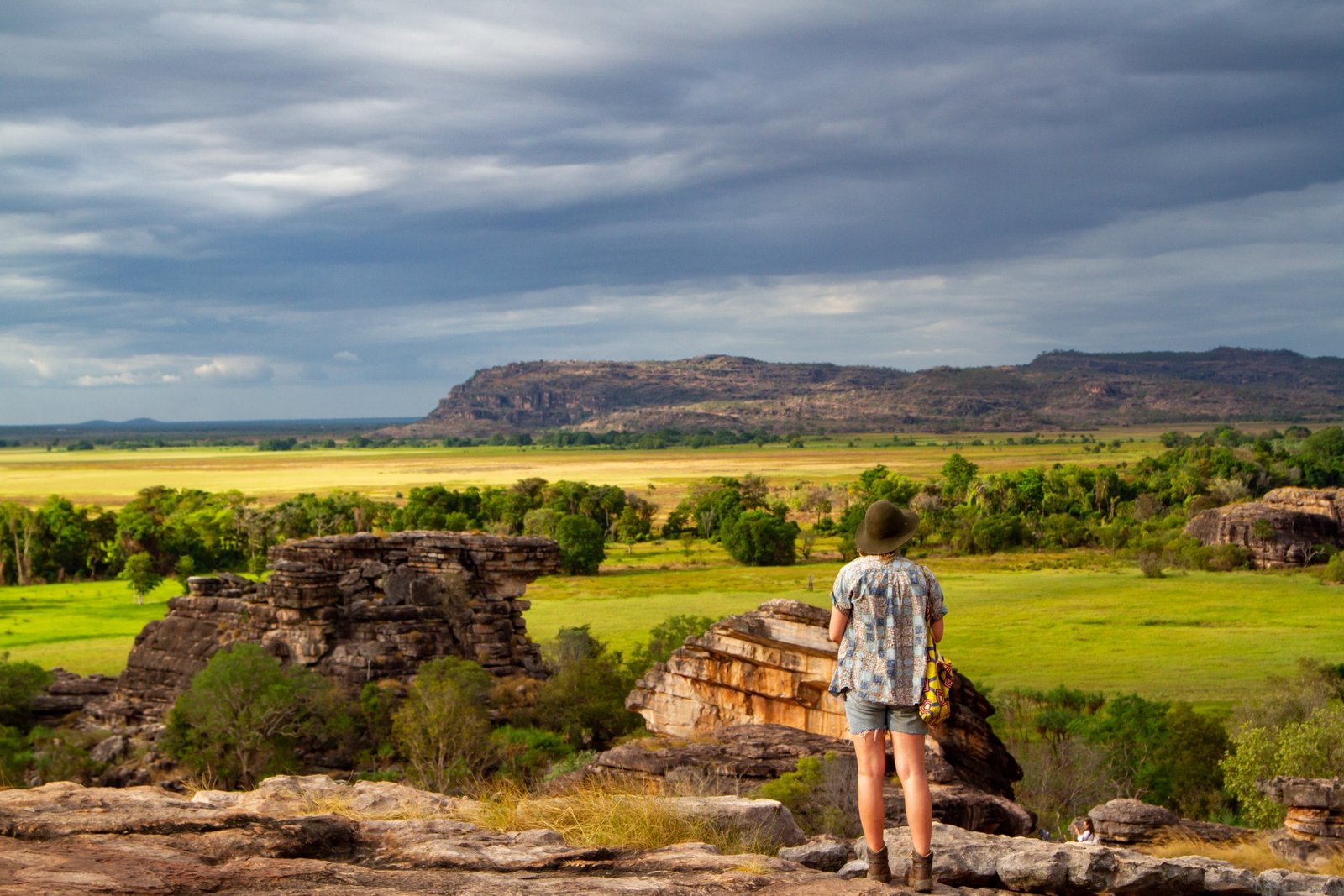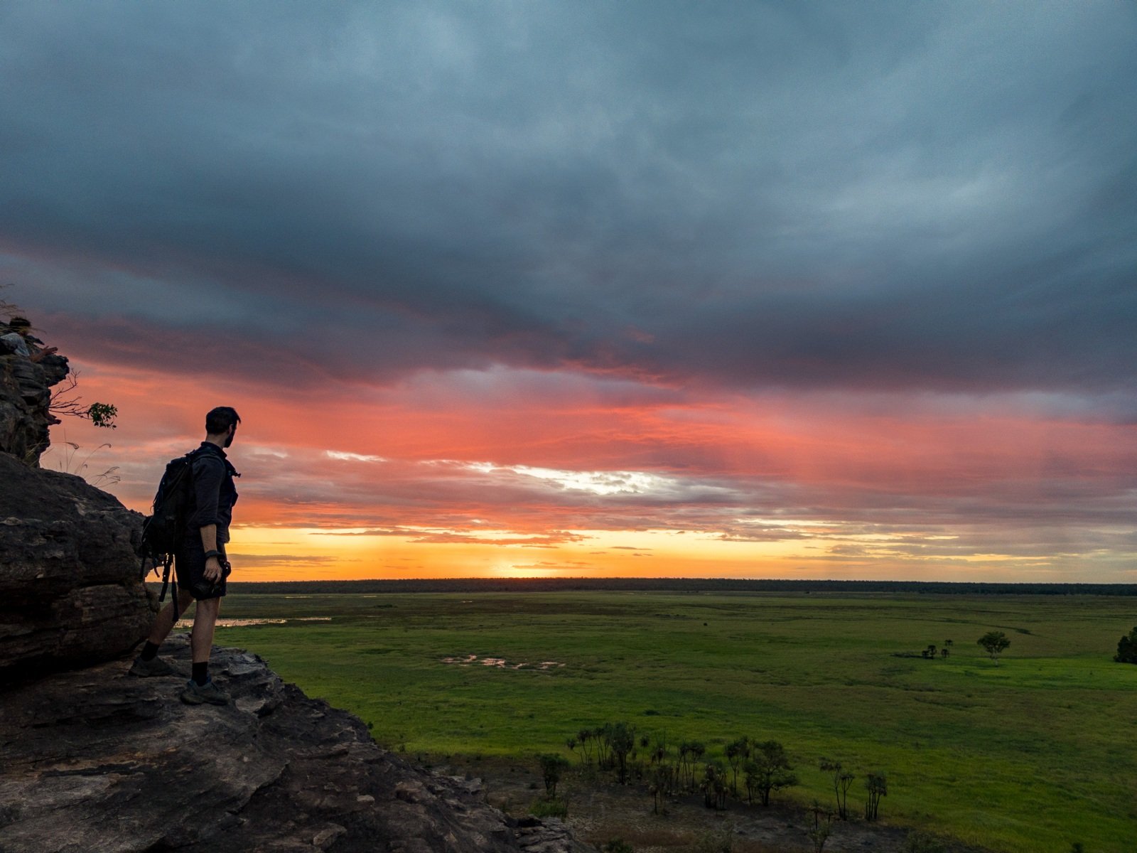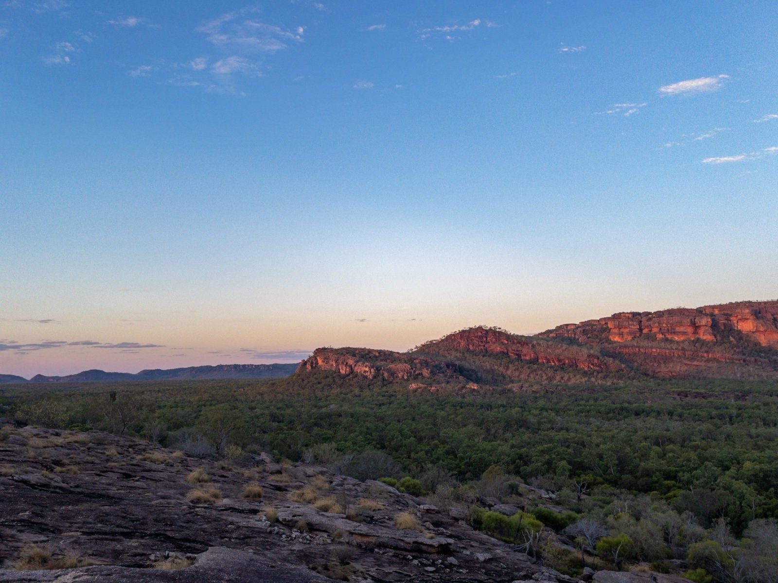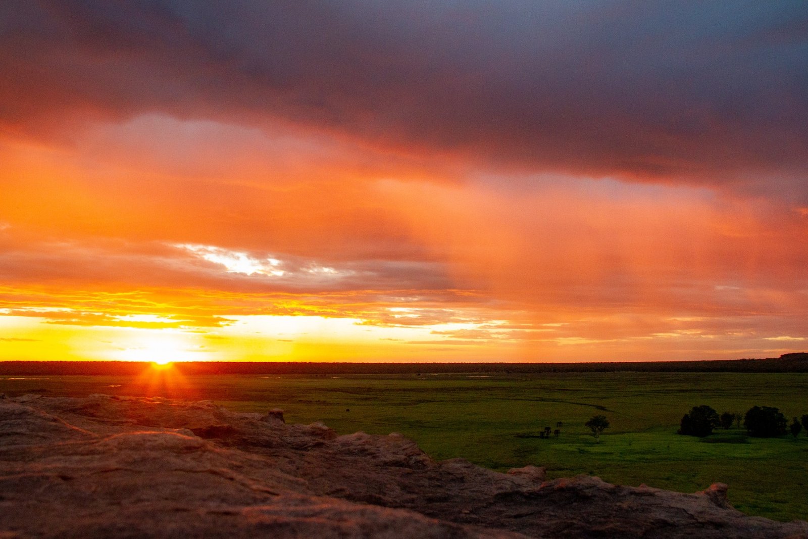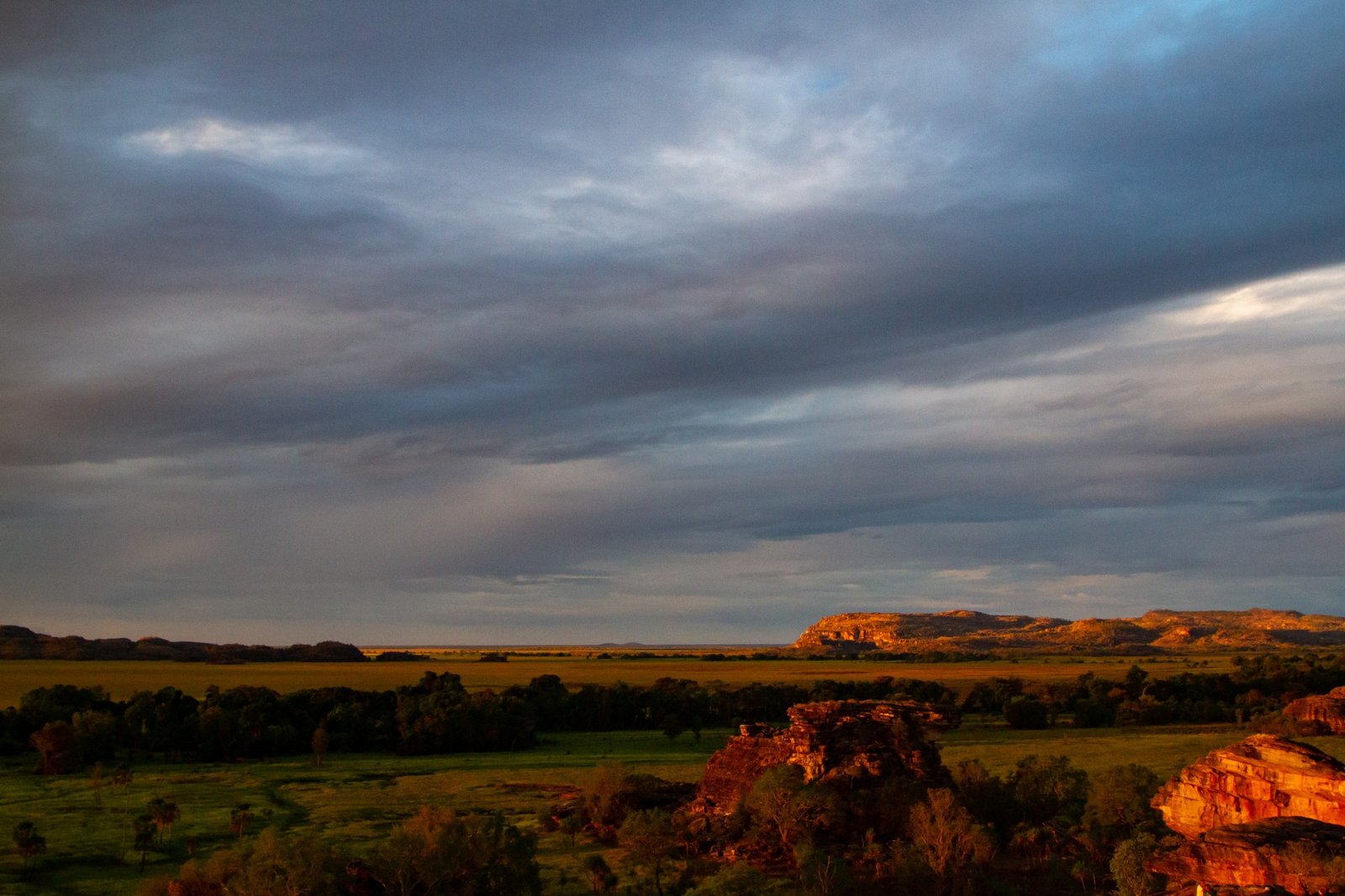Higher up on the rocks we start to get a view of the surrounding countryside. In front of us a big floodplain made patchy with shadows by the clouds overhead. Around to our left there are green tree-covered hill and rocky outcrops with taller mountains in the distance behind. On our right is the lower parts of Ubirr and two great rock faces in the distance, separated by Nadab’s green plain. Finally, behind us is a long wide section of low green bushland stretching into the distance, from which small fires trail pale smoke into the evening air.
