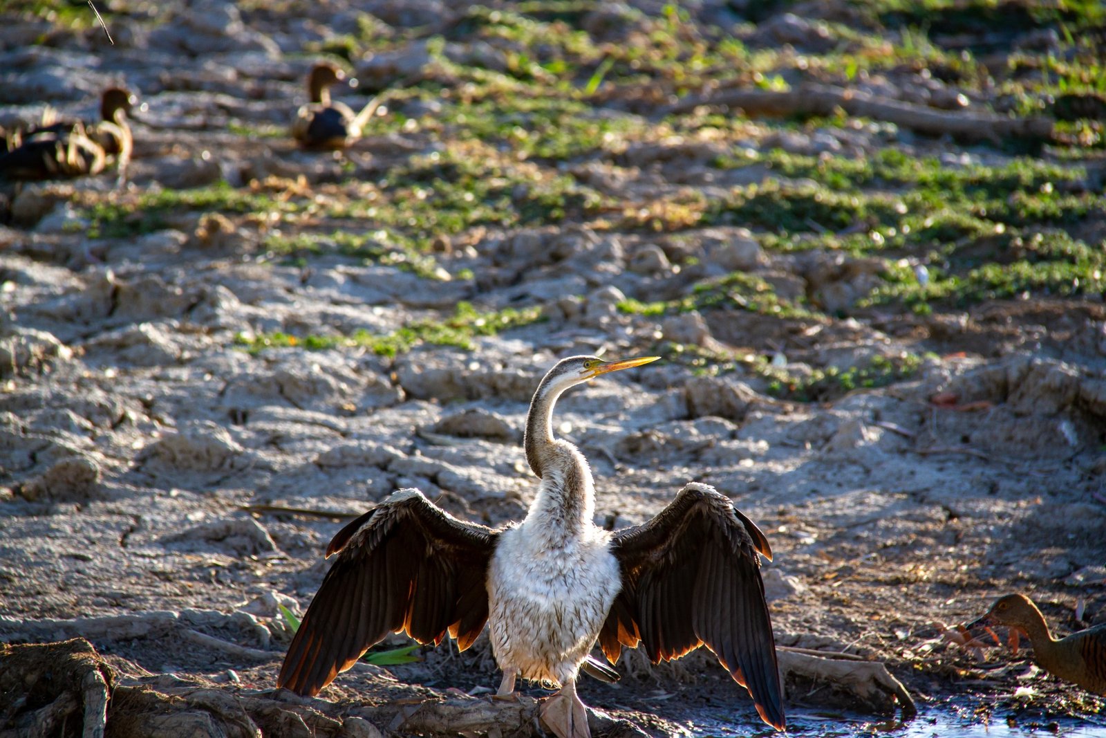 Mostly they float in absolute stillness. Then in a sudden splash one will grab a fish from the water, tossing it back into its mouth.