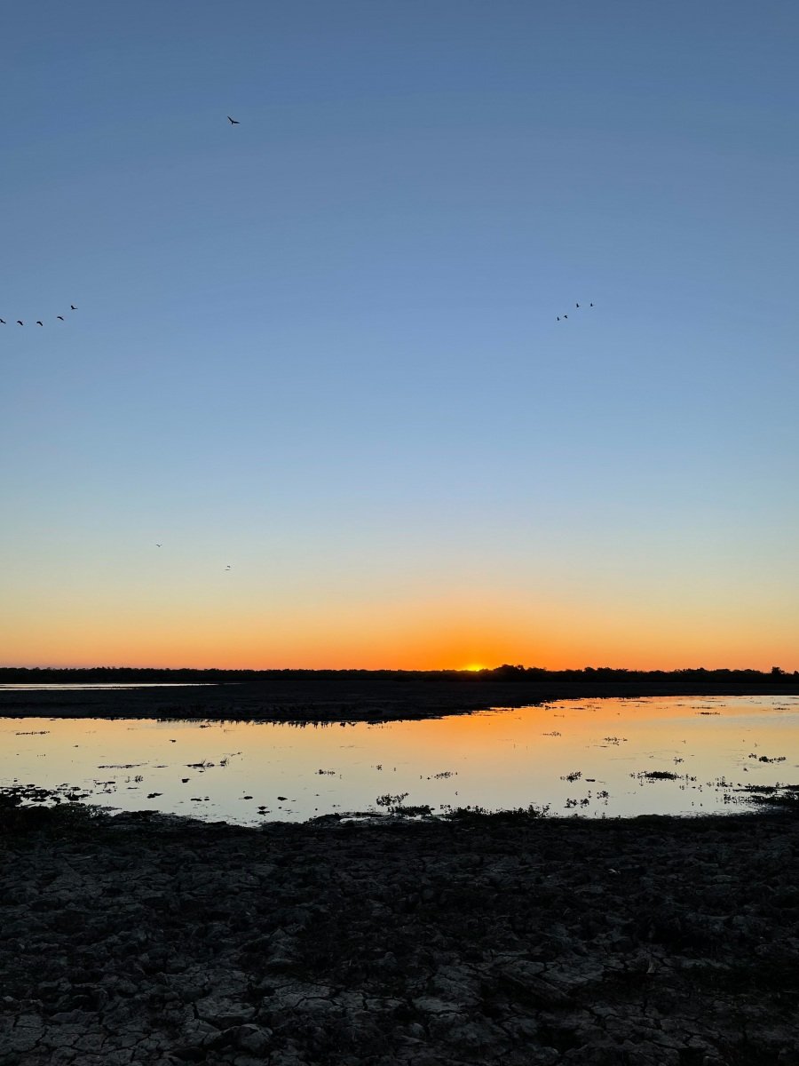 As the sun approaches the horizon the clouds overhead begin to colour, and a tiny rain shower drops over us. In the distance the rain sparkles yellow and orange [Anna: Note that rains this early are not normal and an indication of climate change… but thank you to climate change for our wonderful sunset!].