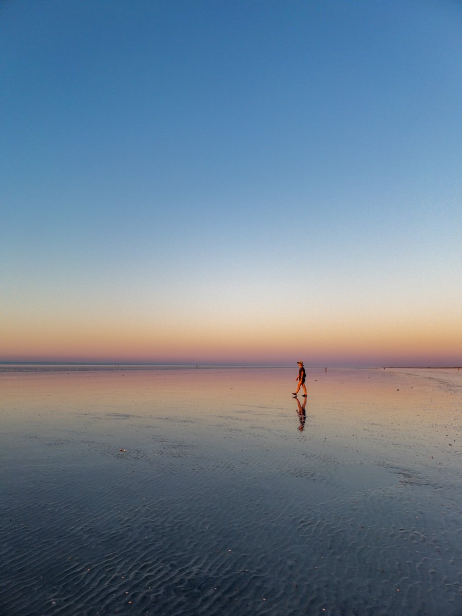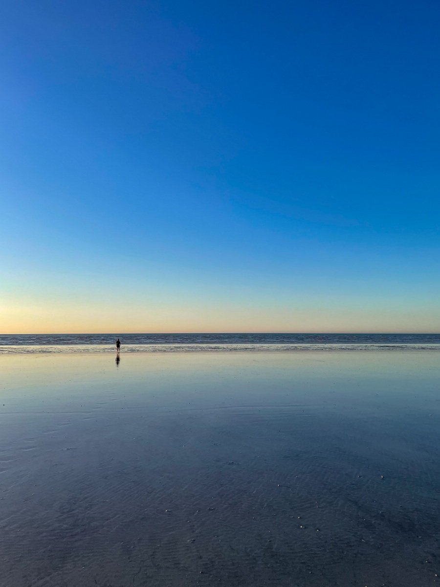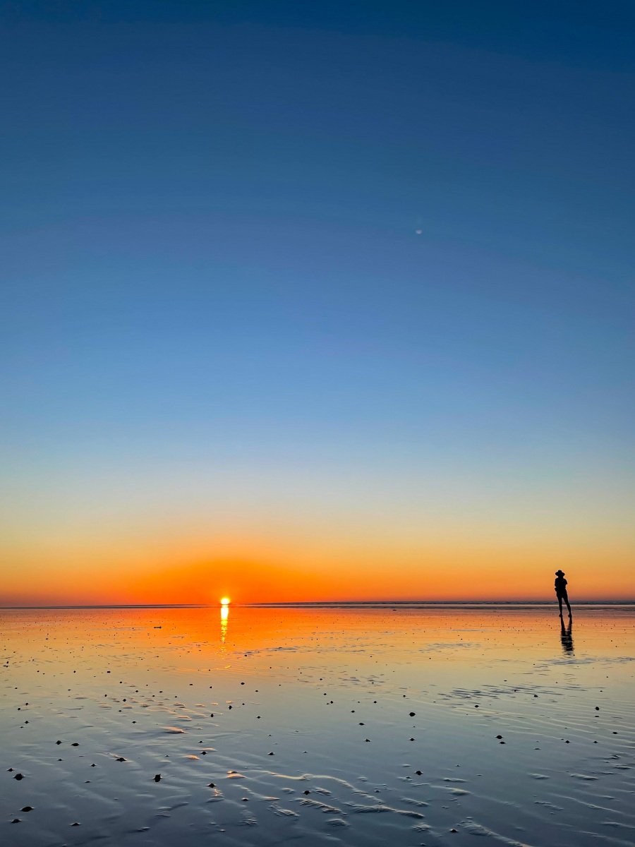 At sunset the wet sand create sky-sized reflections right out to the horizon. Even though the sound of footsteps travel far across the ground, there are minutes of silence as we take in the shifting hues of this magical scene.